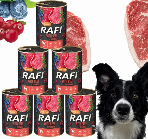 ✅ Mokra karma Rafi z wołowiną charakteryzuje się wysoką zawartością pełnowartościowego białka przy niskiej zawartości tłuszczu.
