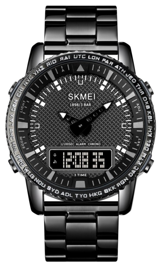Zegarek Skmei to prawdziwe narzędzie do zarządzania męskim czasem - funkcjonalny i niezawodny, zaprojektowany z myślą o mężczyźnie, który potrzebuje czegoś więcej niż tylko wskazania godziny. Teksturowana tarcza nadaje mu głębi i surowego, męskiego charakteru, wyróżniając go spośród typowych, gładkich modeli.Obramowanie z wygrawerowanymi skrótami miast i stref czasowych, takich jak NYC, LON, czy SYD, podkreśla jego globalny styl i przydatność dla mężczyzny, który żyje i działa na poziomie międzynarodowym.