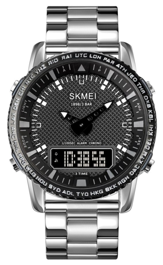 Zegarek Skmei to prawdziwe narzędzie do zarządzania męskim czasem - funkcjonalny i niezawodny, zaprojektowany z myślą o mężczyźnie, który potrzebuje czegoś więcej niż tylko wskazania godziny. Teksturowana tarcza nadaje mu głębi i surowego, męskiego charakteru, wyróżniając go spośród typowych, gładkich modeli.Obramowanie z wygrawerowanymi skrótami miast i stref czasowych, takich jak NYC, LON, czy SYD, podkreśla jego globalny styl i przydatność dla mężczyzny, który żyje i działa na poziomie międzynarodowym.